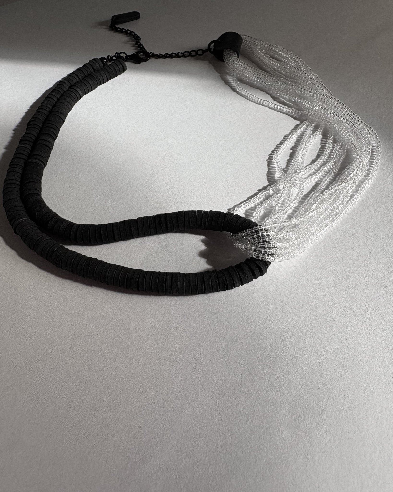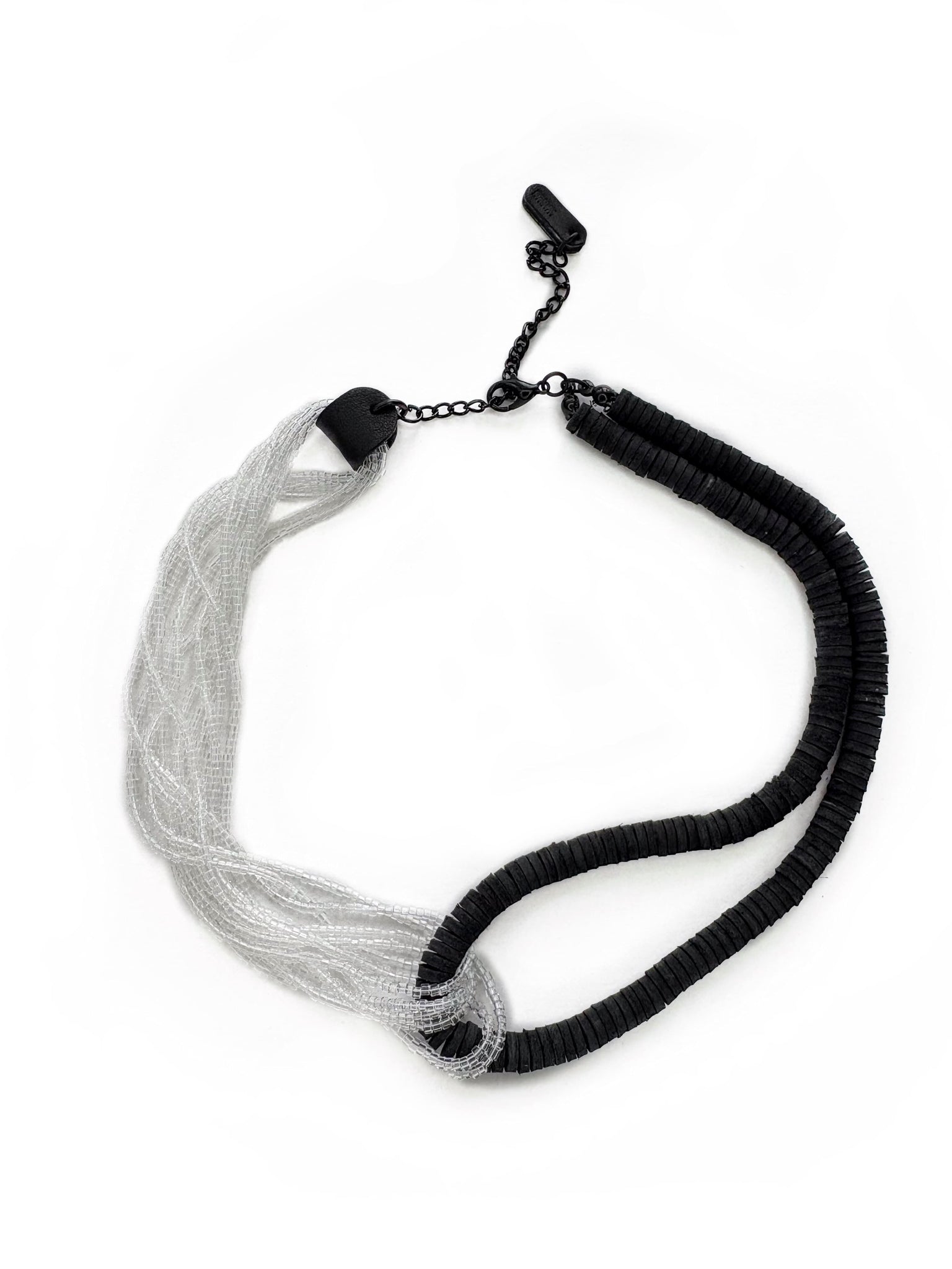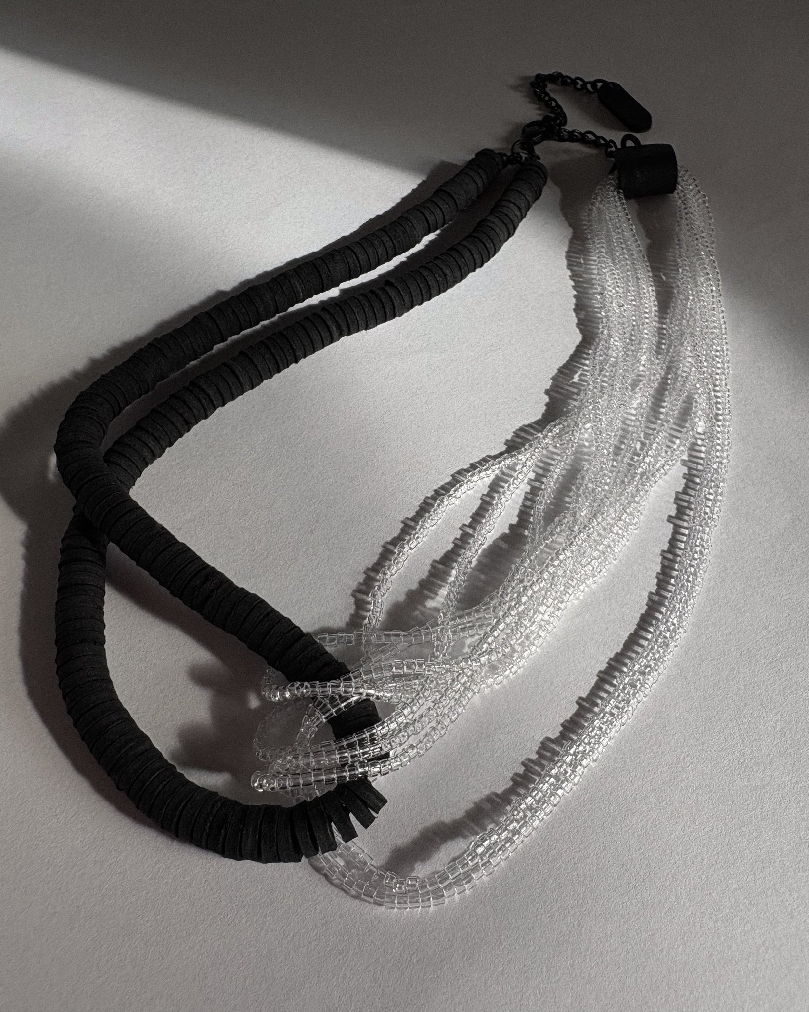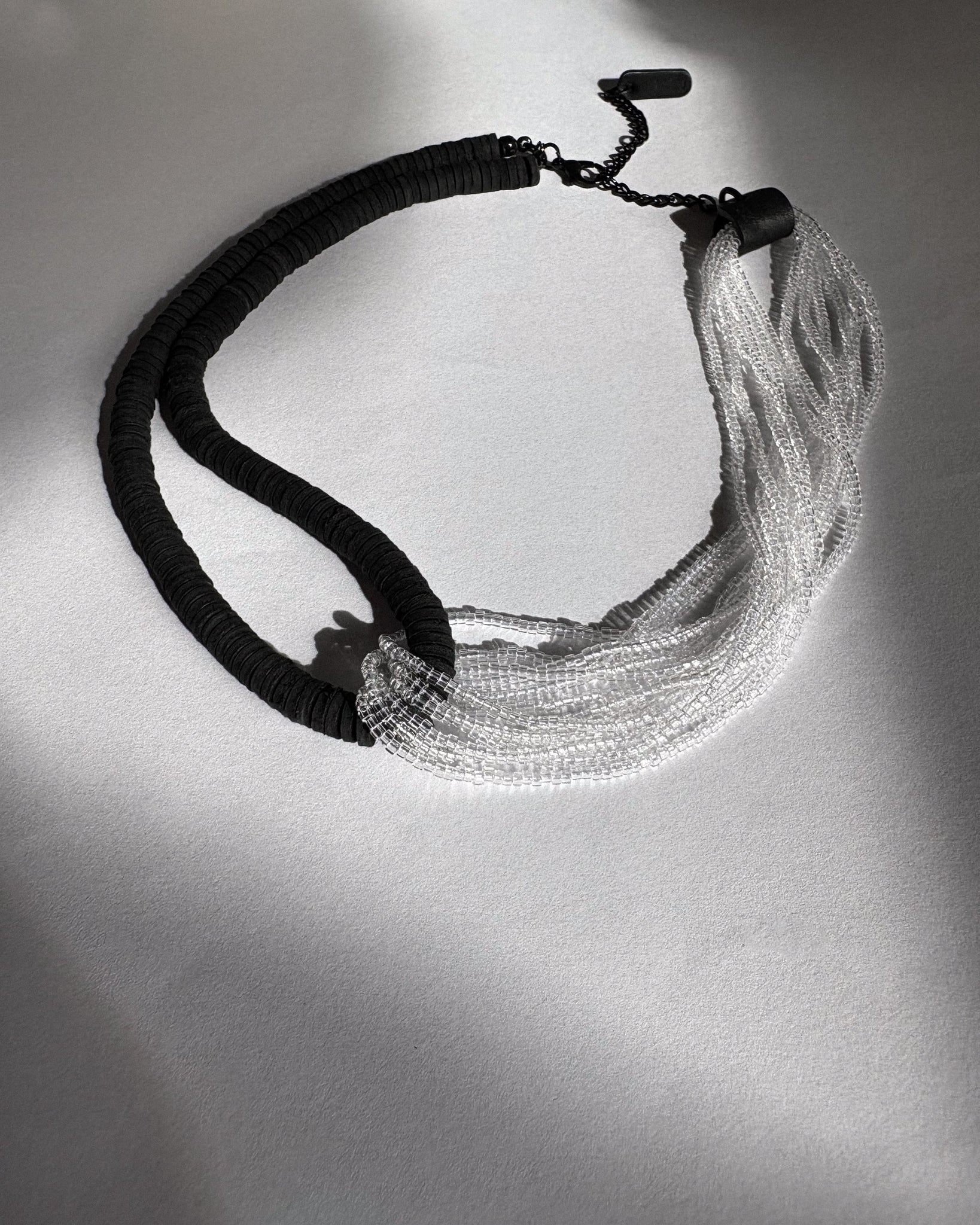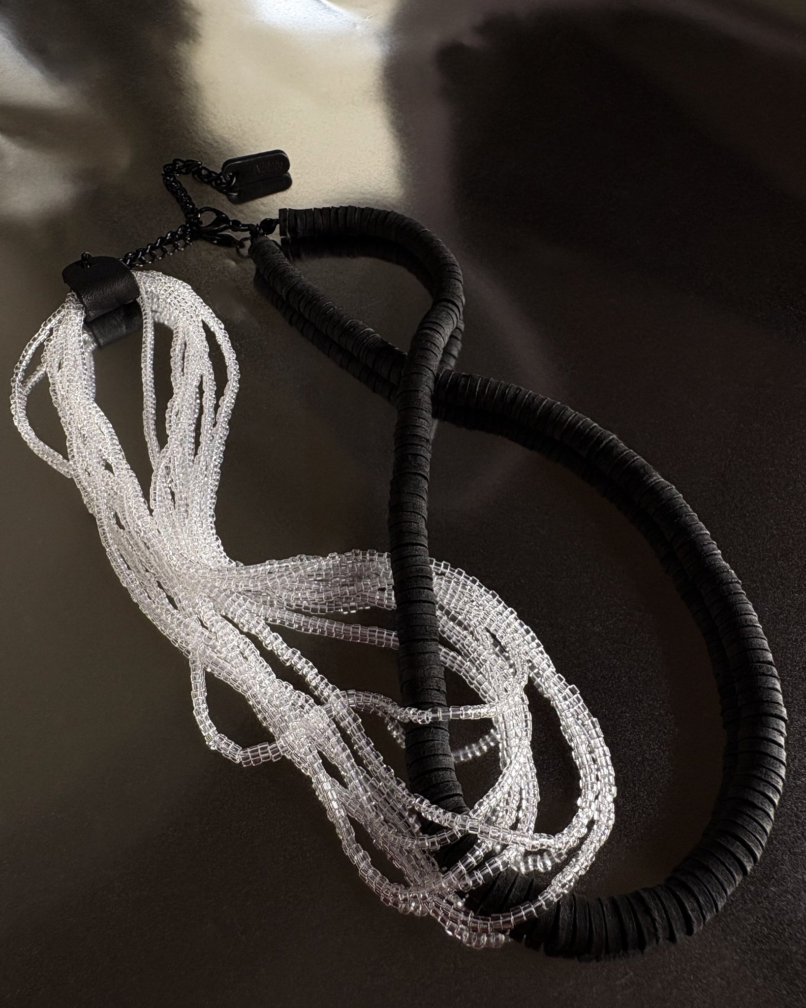 A statement choker handcrafted from strands of hand-punched leather disks and transparent glass beads. The design is built around an interlocking form, where the leather strand loops through cascading bead strands, binding them into a sculptural crossing that holds both tension and flow. The contrast of matte black leather with light-catching beads creates a rhythm that is both tactile and fluid.